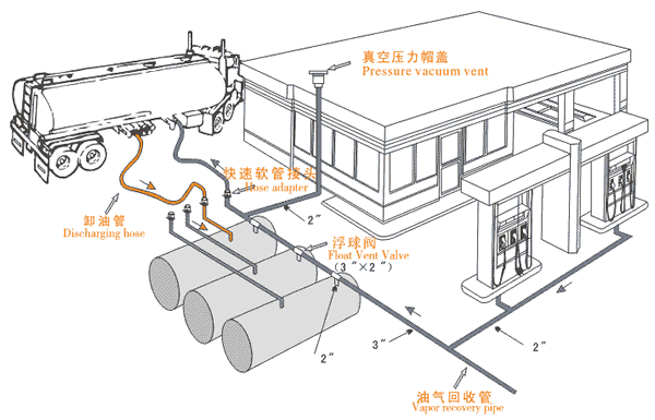 2、通過卸油管、回氣管、快速接頭等將油罐車和地下儲(chǔ)油罐組成密閉系統(tǒng);